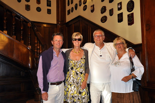 Vanuit de haven kijk je op panden die voorzien zijn van rijen balkons met veel ramen, of te wel “galérias”. Deze raambalkons beschermen de huizen tegen de harde wind vandaar de de bijnaam “de glazen stad.”. Via een poortje kom je op een enorm plein ” Praza Maria Pita” terecht. Hier staat ook het mooie stadhuis. Op dit plein staat een groot scherm waar we zondagavond de WK voetbal wedstrijd Nederland- Spanje gaan volgen tussen allemaal Spanjaarden. Er zijn nu ongeveer 6 Nederlandse schepen in de haven van La Coruña. Met de één heb je meer contact dan met de ander. Maar het is erg leuk om elkaars verhalen, belevenissen aan te horen en ervaringen uit te wisselen. Met Roderick en Yvonne van de Happy Bird op zaterdagavond 10 juli uit eten geweest in de Yacht club( Real Club Nautico de la Coruña). Nette kleding is verplicht. Bij de Yachtclub kom je binnen waar een portier ons verwelkomt, gekleed in een smetteloos wit uniform. De entree lijkt net op een kasteel met houten glimmende trappen met balustrade. Aan de wand emblemen en prijzen van gewonnen wedstrijden. De tafel is prachtig gedekt en je hebt een super uitzicht over de haven. We nemen het dagmenu, 2 biertjes, 2 flessen wijn en een fles water. En wat rekenen we af, 57 euro voor vier personen. Geen geld dus.