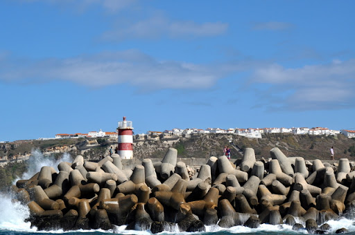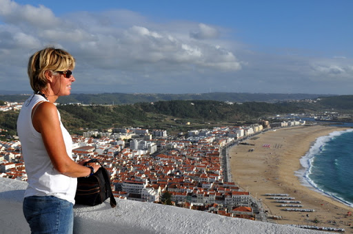 Met wat bewolking en te weinig wind motoren we op maandag 6 september 2010 rond kwart voor zes de kleine haven van Nazaré binnen. Vol wordt er geroepen. Ja, en wat moet je dan. Doorvaren is geen optie want het wordt al weer aardig vroeg donker en met al die vlaggetjes ( krabbenvangers) die je onderweg tegenkomt op de oceaan doe je dat liever niet. In de privé haven vlak bij mogen we van een aardige Portugees langszij komen liggen. De volgende dag komt er een havenmeester langs en betalen we alsnog de volle pond. De naam Nazaré komt naar men zegt van een beeld van Maria dat in de 4e eeuw door een monnik uit Nazareth werd mee genomen. We zijn met een kabeltrammetje recht tegen de heuvel op 110 meter naar boven gegaan. Je komt dan in de oude kern Sitio terecht. Met een wirwar van straatjes die uitkomen op een groot plein met een kathedraal. Veel souvenirs winkeltjes en eettentjes en een schitterend uitzicht over het lager gelegen Nazaré.