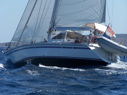 Wij vertrekken rond één uur samen met de Wing IV. Eerst is het dobberen geblazen met af en toe een rare rukwind maar dan maken we kennis met de meltémi wind die hier in de Cycladen erg tekeer kan gaan. We reven en gaan nog als een speer. Het is wel opletten geblazen want er zitten nare valwinden tussen. We zien 33.8 op de windspeed. We laten het anker vallen bij kaap Sounion. Vanaf hier hebben we een mooi uitzicht op de ruïnes van de tempel van Poseidon op de steile klippen langs de Egeïsche Zee. De witte marmeren zuilen vormen al eeuwen lang een oriëntatie punt voor zeelieden. Dinsdag 4 september 2012 vertrekken we naar voor ons het eerste eiland van de Cycladen het eiland Kea. Onderweg aardig wat golven en wind. We gaan voor anker in de Kavia baai. De New Breeze en Le Clapotis komen ook deze kant op. Zonder dat we er erg in hebben valt onze vlag met vlaggenstok in het water. Gelukkig ziet Maud iets drijven en pikt Dick onze vlag op. Is ie gelijk gewassen. We maken een wandeling rond de baai en zien veel kapelletjes en molens en onafgemaakte woningen. Het plan is om zelf op de boot te koken maar alle acht belanden we heel toevallig op het terras van een heerlijk restaurant. De keuze is snel gemaakt. Er wordt harde wind voorspeld dus we gaan de volgende dag een veilig plekje zoeken op het eiland Kythnos. We meren af aan de kademuur bij Merikha.