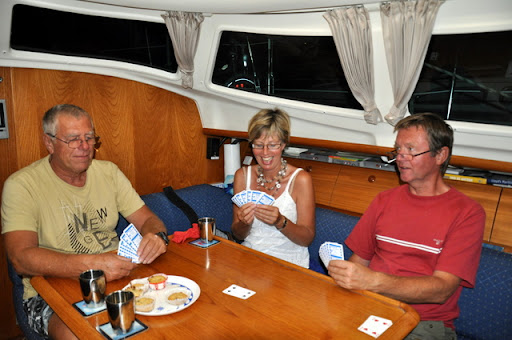Wij gaan binnenkort naar huis en de Happy Bird gaat naar Marokko en verder. Reden dus voor een afscheidsetentje op de Beau. Het slechte weer is intussen losgebarsten. De regen plenst tegen de ramen, maar wij doen ons te goed aan een maaltijd en een laatste potje klaverjassen. Goh hebben we dat niet al eens eerder gehoord.