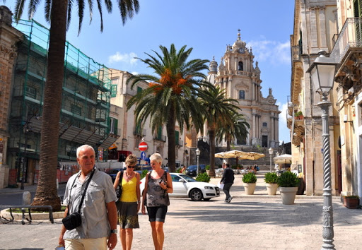 Op vrijdag 7 oktober2011 gaan we met de bus naar de stad Ragusa. Ongeveer 20 km van het dorpje Marina di Ragusa . Deze stad ligt op een hoogte van 497 meter en heeft veel hoogte verschillen. En dat hebben we geweten. We lopen via heel veel trappetjes en oude zeer vervallen huisjes naar benden naar het oude stadsdeel Ragusa Ibla. Ragusa is één van de Barokke steden in de Val di Note die op de wereld erfgoedlijst van de Unesco staan. We zien de domkerk San Giorge, kerk San Giuseppe en pallazo Sortino-Trno en nog veel meer. We eindigen in het park Gardini Ibiel. Via een alternatieven route met veel blaffende honden stijgen we om zo weer in de bewoonde wereld terecht te komen.