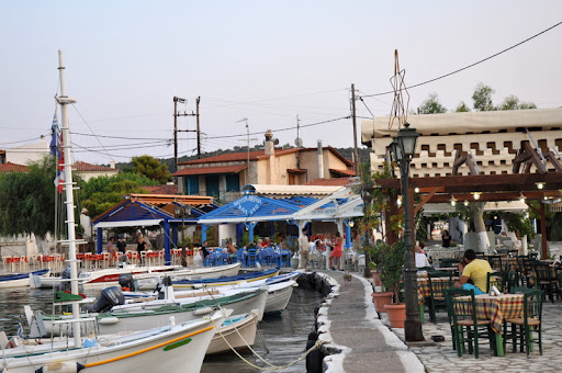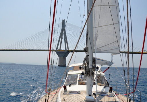 Vrijdag 27 juli 2012 motoren we verder de golf van Patras in. In de verte zie je al de enorm grote Rion- Andirrion hangbrug opdoemen. Zo’n vijf mijl voor de brug dien je je zelf op te roepen en wordt er gezegd naar welke peiler van de brug je moet varen. Eén mijl voor de brug roep je weer op om permissie te vragen voor doorvaart. Aan de andere kant van de brug varen we in de golf van Korinthe. Yes de wind trekt aan en we zeilen zo voor het windje naar het eiland Trizona. Wij gaan voor anker. Het plaatsje is best schattig en heeft een mooi uitzicht naar het vaste land van Griekenland. Maar wat doet de onafgemaakte haven triest aan. Daar liggen blijvertjes. Mensen die daar hun boot hebben achtergelaten en nooit meer zijn teruggekeerd. Er ligt zelfs een gezonken zeilboot midden in de haven. ’s Avonds om elf uur zien we op een terras de opening van de Olympische Spelen in London. We belanden nog veel later op le Clapotis van Cees en Marijke. Zij liggen aan de kade van Trizonia. Het wordt een latertje.We blijven een aantal dagen in Fiskardo. Het is nu aardig rustig omdat er geen flottielje is. Op zondag 22 juli 2012 zijn Ingeborg en Willem van de Wing IV al in rep en roer. Ze hebben vannnacht geen oog dicht gedaan want ze denken dat er een rat aan boord is, brrrr. Het afval zakje is aan gevreten en ze horen geluiden achter bij de kooien. Nou daar ben je mooi klaar mee. Er wordt een ratten val gekocht en een tube kleeflijm om het ongedierte te vangen. Tijdens de gezamenlijke koffie, het is zondag niet waar, praten we over hoe zo’n beest in hemelsnaam aan boord kan komen. Via de lange lijnen naar de kant, moet tie als een koorddanser aan boord zijn gekomen. Cees googled ook nog even. Nou als je dat allemaal leest, daar word je niet vrolijk van. Om herhaling te voorkomen, snijden we plastic flessen open en bevestigen die aan de lijnen. Dat zal ze leren, die ratten. ’s Avonds nog even naar de kant voor een lekker ijsje. Als we terug zijn aan boord horen we een kreet, hoera ze hebben de rat gevangen met de kleeflijm die ze op karton hebben gesmeerd. De rat krijgt een zeemans graf.