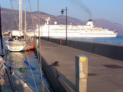 Omdat het meestal erg druk is in Fiskardo staan we voor ons doen op donderdag 19 juli 2012 bijtijds op. Als we de ankerketting op halen in de baai bij Groot Vathi blijkt er zomaar gratis een vierpuntig anker aan onze ketting te hangen. Oeps deze heeft al een tijdje op de bodem gelegen. Met een andere lijn en de pikhaak wordt tie weer losgewurmd. Omdat er in dit gebied meestal een noord/weste wind staat moeten we een deel motoren. Onderweg komen we mega jachten tegen. Zelfs één met een helicopter aan boord. Je hebt altijd baas boven baas.